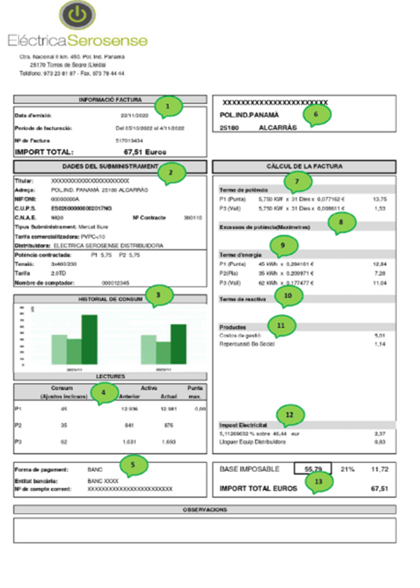 Per a ajudar-te a entendre la factura de la llum, et deixem una petita explicació de cada secció clau: des de la identificació de la factura, les dades del subministrament, el consum històric i la lectura del comptador, fins al càlcul del total a pagar.